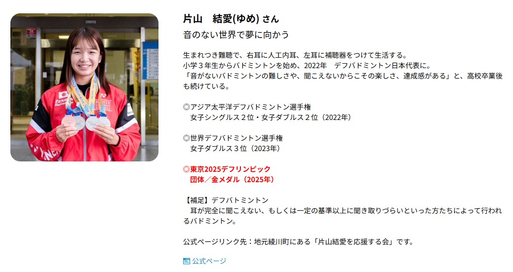 『デフリンピックに出場している片山選手がバドミントン団体で金メダルを獲得しました。』
