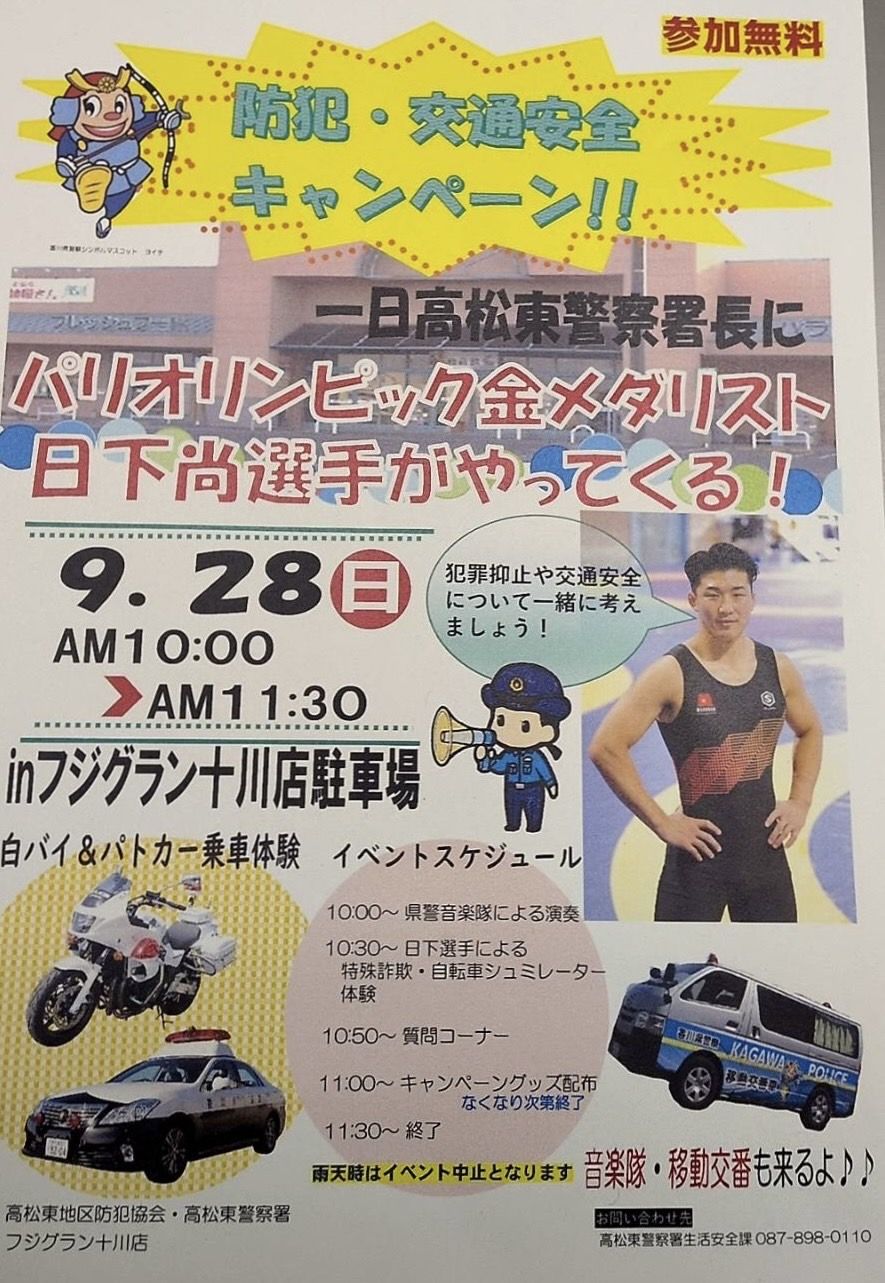 9月28日(日)、高松東署において、日下尚選手が一日警察署長をつとめるイベントが開催される。